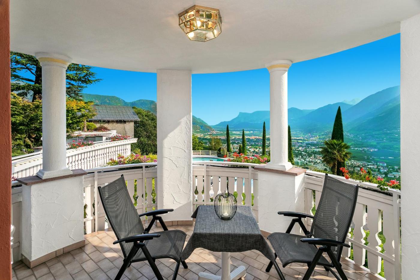 Camera Matrimoniale con Balcone o Terrazza. Questa camera matrimoniale dispone di balcone, minibar e vista su Merano e sui vigneti circostanti. ;
